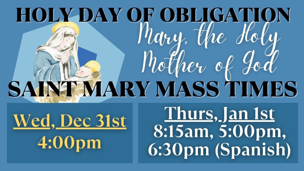 JANUARY 1ST: Solemnity of Holy Mother of God is a Holy Day of Obligation. Mass times are December 31st at 4pm; January 1st at 8:15am and 6:00pm in the church.