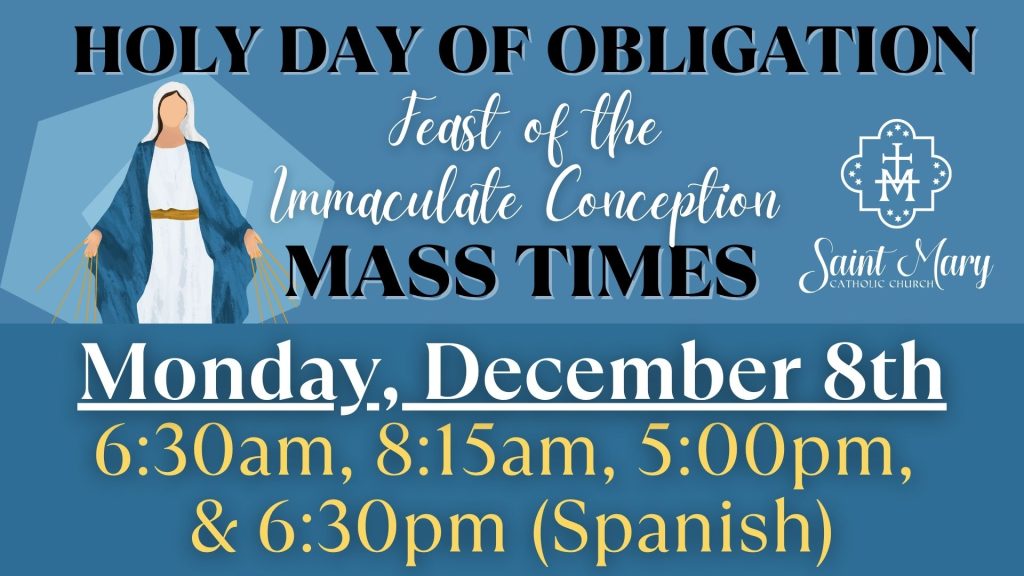 DECEMBER 9TH: Solemnity of the Immaculate Conception IS NOT a Holy Day of Obligation this year. We will still have our 8:15am Mass, so please join us.