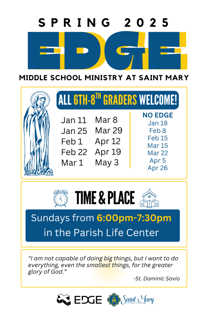 Edge is a ministry for 6th – 8th grade students seeking to grow closer to Christ and His Church, while building long-lasting friendships.