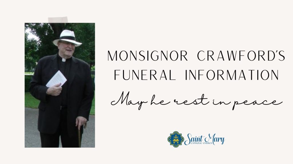 As you may have heard during the announcements before our weekend Masses, Msgr. Crawford died on Friday, October 17th. As we mourn the loss of a faithful priest and spiritual giant of our community, we invite you to pray with us for the repose of his soul. Please see the times below: